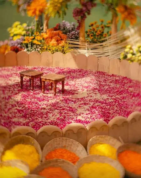 At the heart of the setup is a floral wonderland: a round rose-petal pathway leading to twin wooden stools. The ambiance is elevated by overflowing baskets of golden marigolds and fiery orange petals, symbolizing prosperity and joy in Hindu traditions. This elaborate decor masterfully merges opulence with heartfelt simplicity.