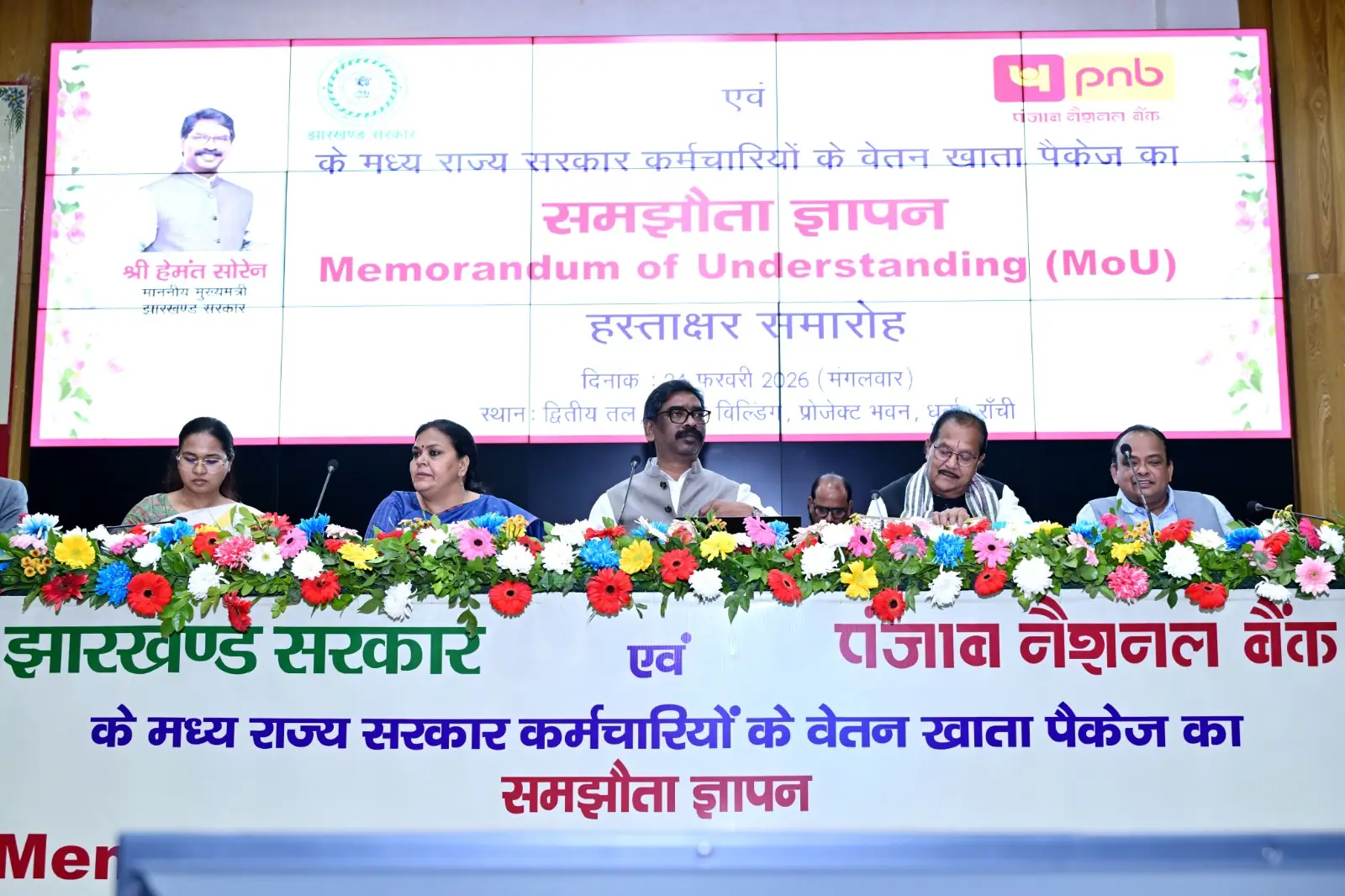 Chief Minister Shri Hemant Soren participated in the Memorandum of Understanding (MoU) signing ceremony between the Jharkhand government and Punjab National Bank for the salary account package of state government employees. On this occasion, Chief Minister Shri Hemant Soren launched the Jharkhand Kuber Dashboard prepared by the Finance Department, Jharkhand Government. Chief Minister Shri Hemant Soren said that an important Memorandum of Understanding (MoU) is being signed between Punjab National Bank and the state government. Punjab National Bank is joining the state government today as a new chapter. The Chief Minister said that banks play an important role in the chain of financial transactions of the common people as well as employees working in the state government. In the present time, banks play a big role in every sector including business, agriculture, rural development. The Chief Minister said that along with all these works, many institutions also have some social responsibilities, and in this sequence, an MoU has been signed between the state government and Punjab National Bank today. Earlier also, MoUs have been signed between the state government and other banks, and work is also being carried forward in accordance with the said MoU. I am confident that Punjab National Bank will successfully fulfill the purpose and duty for which it has joined the state government. The benefit of better coordination between the state government and Punjab National Bank will be available to the general public as well as the employees of the state government. The Chief Minister Shri Hemant Soren said these words in his address at the Memorandum of Understanding signing ceremony between the Jharkhand government and Punjab National Bank for the salary account package of state government employees, organized in the auditorium of Jharkhand Ministry today. The Chief Minister extended his heartfelt wishes and congratulations to the officials and staff of Punjab National Bank present at the MoU signing ceremony. On this occasion, Minister Shri Radhakrishna Kishore, Minister Dr. Irfan Ansari, Minister Shri Sanjay Prasad Yadav, Minister Smt. Deepika Pandey Singh, Minister Smt. Shilpi Neha Tirkey, Chief Secretary Shri Avinash Kumar, General Manager Punjab National Bank Shri Ashish Kumar Chaturvedi, Divisional Head Ranchi Shri Awadhesh Jha, Deputy Divisional Head Shri Rakesh Kumar Srivastava, along with other officials of the state government and office bearers of Punjab National Bank were present.