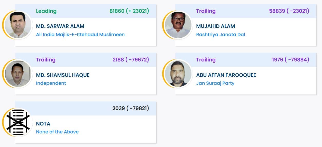 The Kochadhaman assembly seat has been won by AIMIM candidate Md. Sarwar Alam, who achieved a commanding victory. Alam received 81,860 votes, outperforming his nearest opponent, RJD’s Mujahid Alam, by a margin of 23,021 votes. Mujahid Alam secured 58,839 votes in the election. Situated in Bihar’s Kishanganj district, Kochadhaman is a general-category assembly constituency that came into being after the 2008 delimitation. The constituency’s boundaries encompass the entire Kochadhaman block, in addition to the Belwa, Mehangaon, Gachchhpara, Chakla, Daula, and Pichhla gram panchayats within the Kishanganj block. Notably, the Kochadhaman seat has a history of being won by Muslim candidates since its inception. This electoral pattern was previously established by JDU’s Mujahid Alam, who won the 2014 by-election and held onto the seat in 2015.