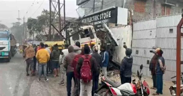A major traffic incident unfolded at Babantoli Chowk on the Tundi route Saturday night when a trailer transporting iron rods lost control. The vehicle collided forcefully with a roadside electricity pole, causing significant damage. The loud noise attracted locals who found the trailer severely impacting the pole. Two transformers mounted on the pole were knocked down and destroyed. A neighboring electronics store also sustained damage from the accident. A fortunate circumstance was the existing power outage in the vicinity, which prevented severe casualties or property destruction. The electricity department was alerted by residents and subsequently cut off power to the affected line for safety. The trailer driver fled the crash site, leaving the heavily damaged vehicle behind. The trailer was reportedly on its way to Giridih.